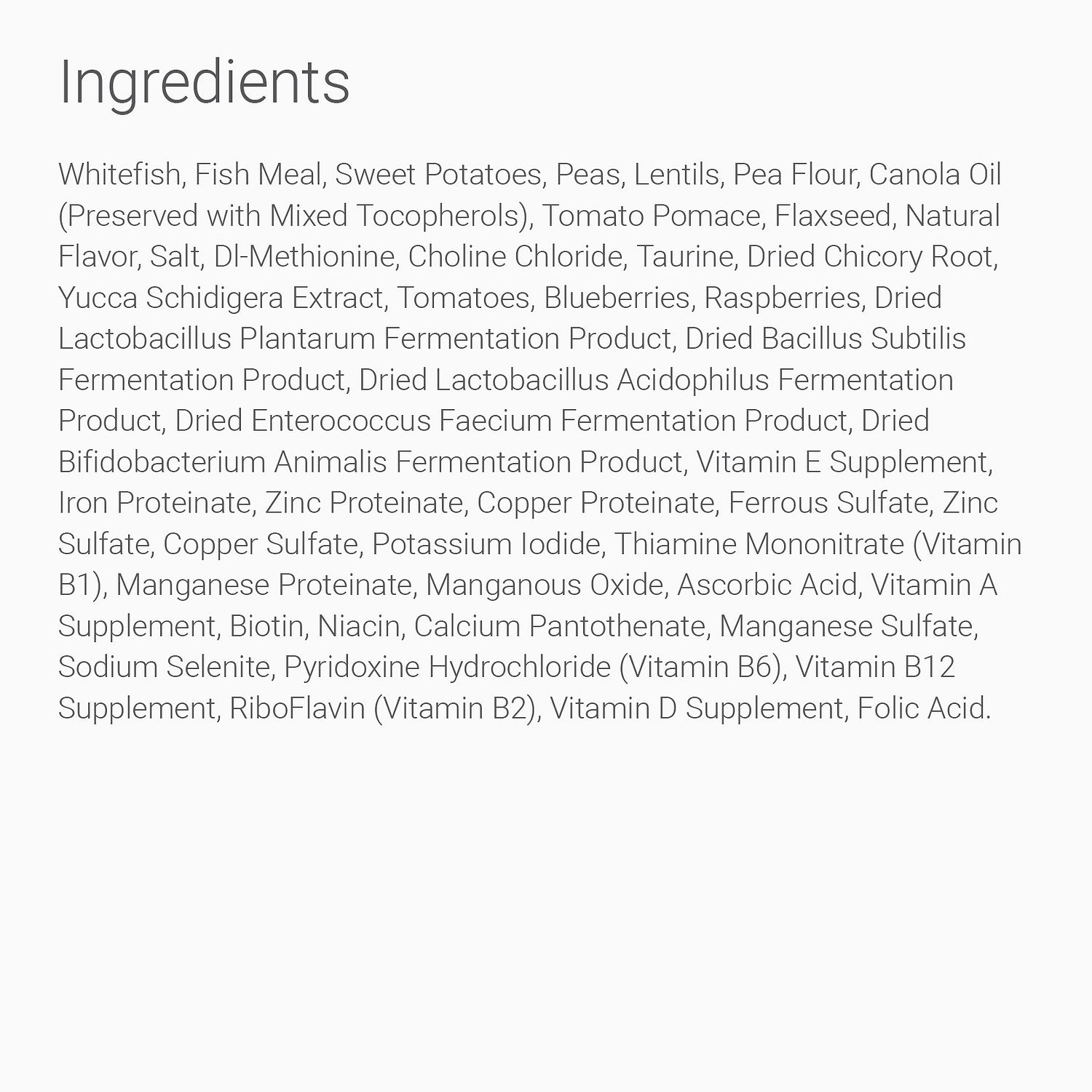 Whitefish, Fish Meal, Sweet Potatoes, Peas, Lentils, Pea Flour, Canola Oil (Preserved With Mixed Tocopherols), Tomato Pomace, Flaxseed, Natural Flavor, Salt, Choline Chloride, Dried Chicory Root, Yucca Schidigera Extract, Tomatoes, Blueberries, Raspberries, Dried Lactobacillus Plantarum Fermentation Product, Dried Bacillus Subtilis Fermentation Product, Dried Lactobacillus Acidophilus Fermentation Product, Dried Enterococcus Faecium Fermentation Product, Dried Bifidobacterium Animalis Fermentation Product, Vitamin E Supplement, Iron Proteinate, Zinc Proteinate, Copper Proteinate, Ferrous Sulfate, Zinc Sulfate, Copper Sulfate, Potassium Iodide, Thiamine Mononitrate (Vitamin B1), Manganese Proteinate, Manganous Oxide, Ascorbic Acid, Vitamin A Supplement, Biotin, Niacin, Calcium Pantothenate, Manganese Sulfate, Sodium Selenite, Pyridoxine Hydrochloride (Vitamin B6), Vitamin B12 Supplement, Riboflavin (Vitamin B2), Vitamin D Supplement, Folic Acid.