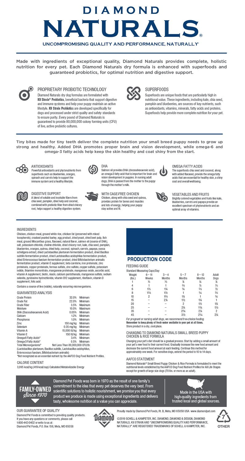 Start your small breed puppy off right with superior nutrition from Diamond Naturals Small Breed Puppy Formula Dry Dog Food! Each Diamond Naturals dry formula is enhanced with superfoods and guaranteed probiotics to support your growing hound’s development and overall health. This dry puppy food recipe is made with real cage-free chicken as the first ingredient followed by real fruits and vegetables including kale, pumpkin, blueberries and oranges! It provides your small puppy with protein and minerals, along with omega fatty acids to help promote healthy skin and a shiny coat, plus antioxidants for overall nose-to-tail well-being. Help your pal achieve a complete and balanced holistic diet with Diamond!