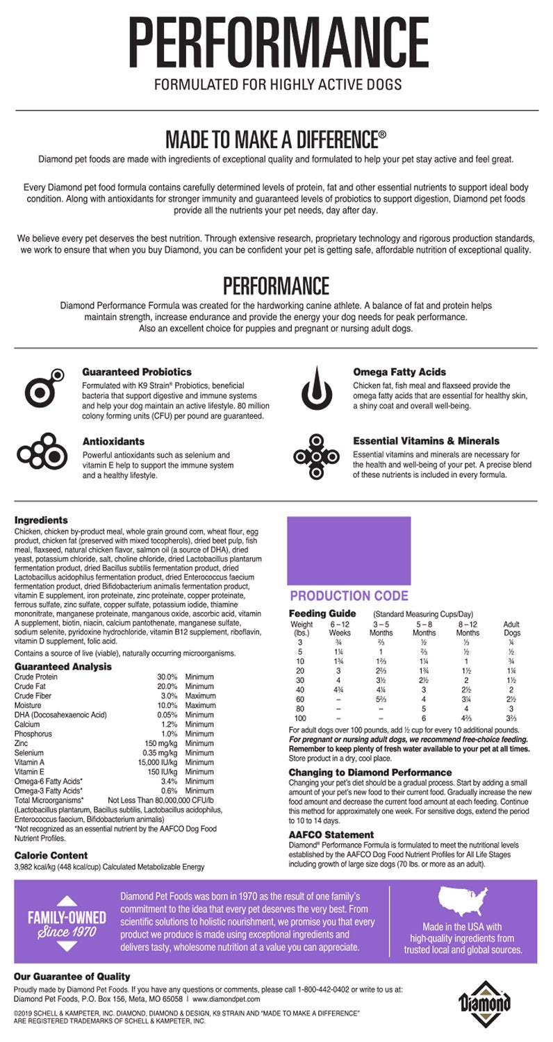 Give your canine companion the precious gift of premium nutrition with Diamond Performance Formula Adult Dry Dog Food! Formulated from the highest quality ingredients, this food is made to make a difference with carefully determined levels of protein, fat and other vital nutrients to support your moderately active pal’s ideal body condition. Essential minerals are chelated with amino acids to optimize their absorption and ensure maximum benefit. It’s also fortified with antioxidants and fiber for digestive and immune system support to help make sure your best friend gets all the nutrients she needs to stay healthy and happy.