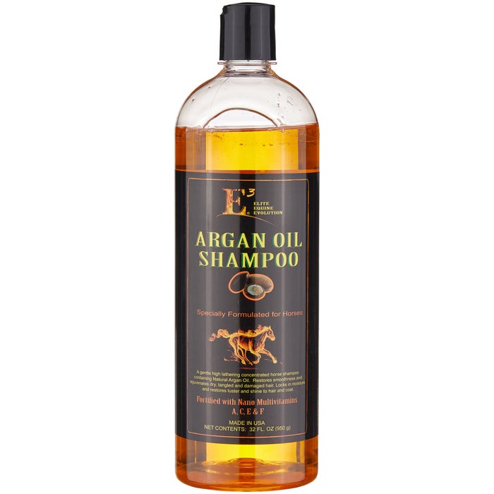 E3 Moroccan Argan Oil Shampoo by Elite Equine Evolution is a gentle, high lathering concentrated horse shampoo. It deep cleans while restoring smoothness and rejuvenating dry, tangled or damaged hair. The unique vitamin fortified formula locks in moisture and restores a natural shine to hair and coat.