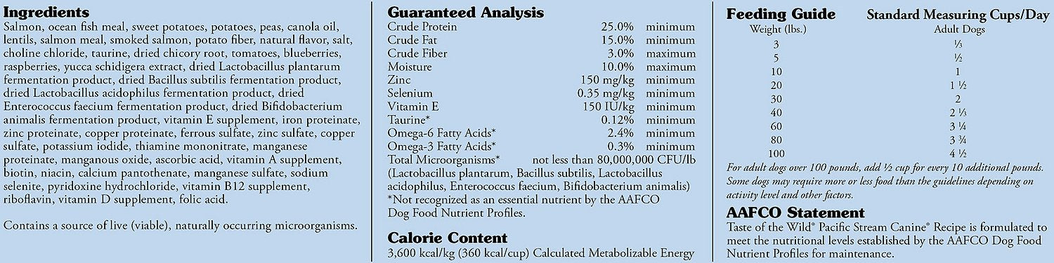 Nourish your furry friend with the balanced diet nature intended when you feed him Taste of the Wild Pacific Stream Grain-Free Dry Dog Food. Formulated with novel proteins including real smoked salmon, this grain-free recipe includes peas and sweet potatoes that deliver the highly-digestible energy your active pup needs, along with natural antioxidant support from real fruits and vegetables and dried chicory root for prebiotic support and healthy digestion. Essential minerals are chelated with amino acids to optimize their absorption and ensure maximum benefit, for complete and balanced nutrition with a taste of the wild your furry pal will crave.