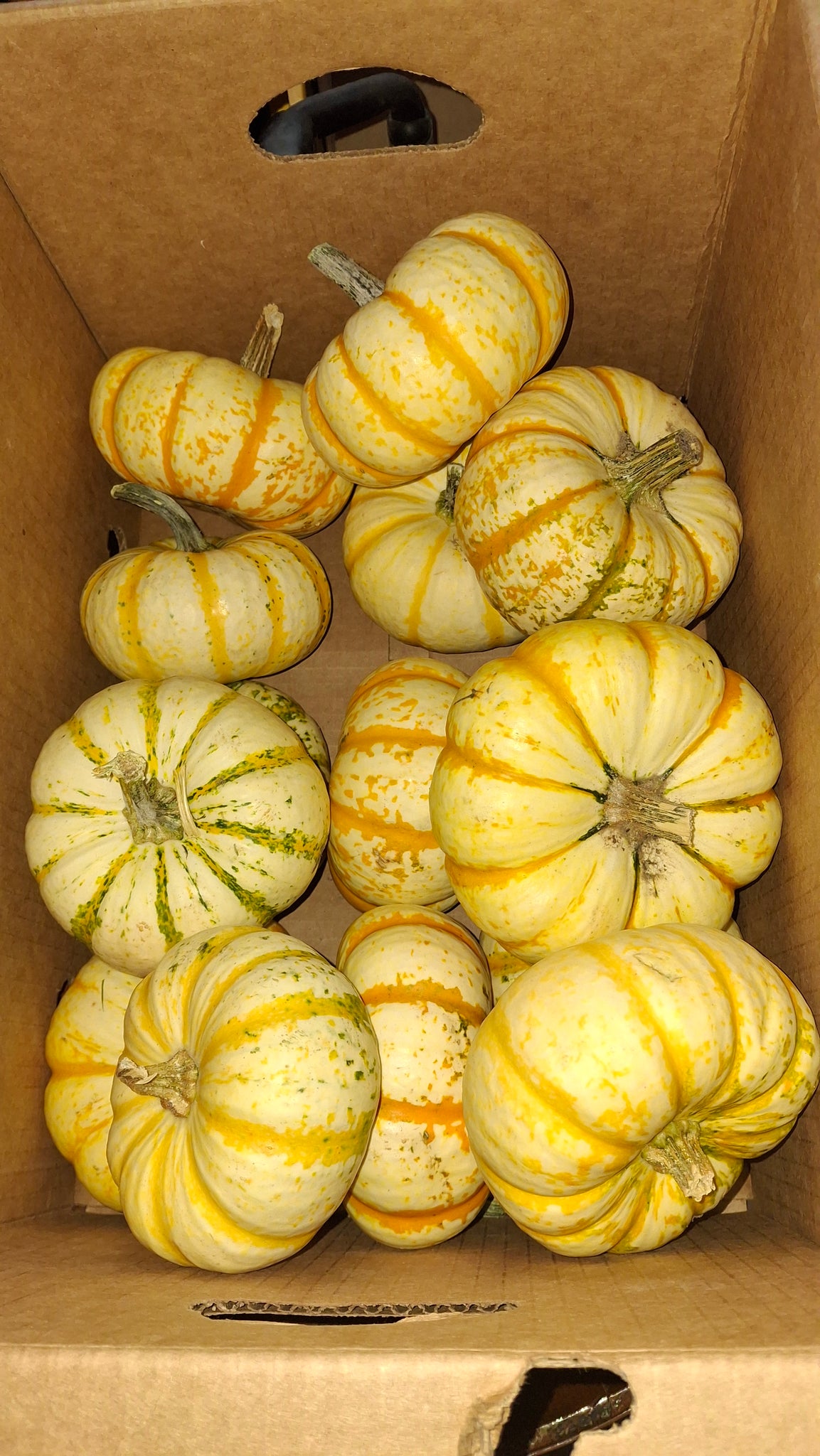 Small, white pumpkins perfect for seasonal dรฉcor, table centerpieces, or crafting.