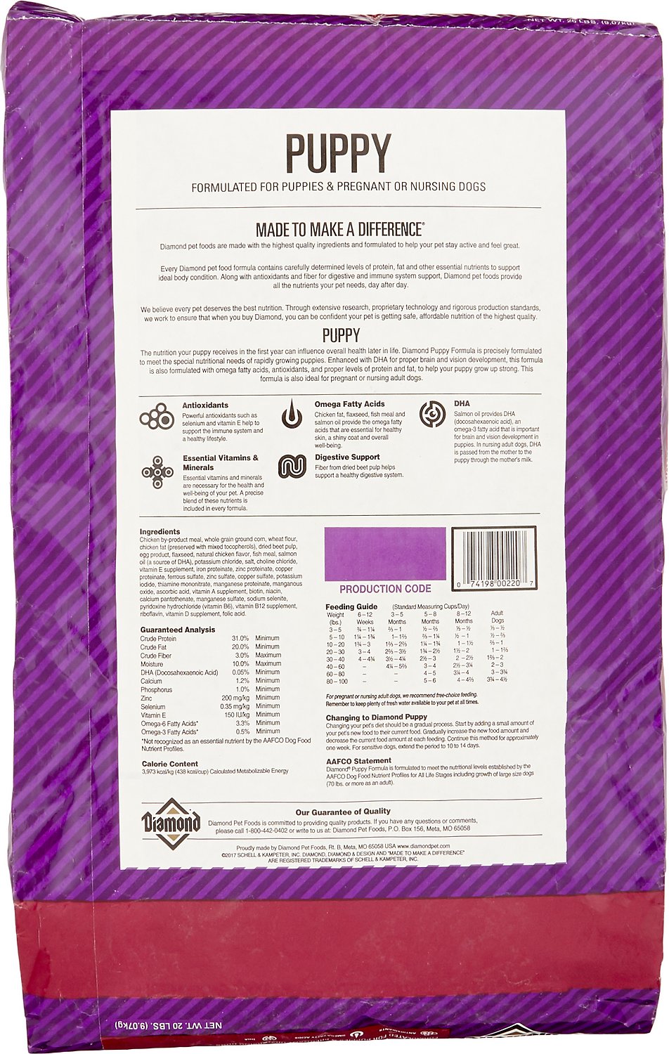 Give your puppy pal the precious gift of premium nutrition with Diamond Puppy Formula Dry Food. Formulated from the highest quality ingredients, this food is made to make a difference with carefully determined levels of protein, fat and other vital nutrients. This recipe is specially formulated to meet the special nutritional needs of rapidly growing puppies. DHA from salmon oil help to support strong eyesight and healthy brain function. It’s also fortified with antioxidants and fiber for digestive and immune system support to help make sure your little guy gets all the nutrients he needs to thrive, day after day.