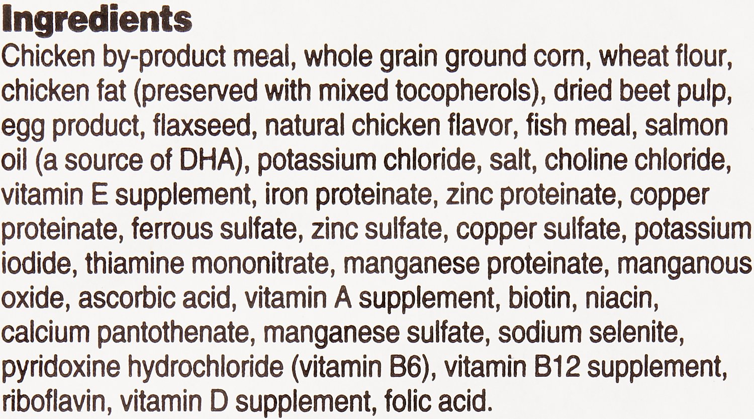 Chicken By-Product Meal, Whole Grain Ground Corn, Wheat Flour, Chicken Fat (Preserved With Mixed Tocopherols), Dried Beet Pulp, Egg Product, Flaxseed, Natural Chicken Flavor, Fish Meal, Salmon Oil (A Source Of Dha), Potassium Chloride, Salt, Choline Chloride, Dried Lactobacillus Plantarum Fermentation Product, Dried Bacillus Subtilis Fermentation Product, Dried Lactobacillus Acidophilus Fermentation Product, Dried Enterococcus Faecium Fermentation Product, Dried Bifidobacterium Animalis Fermentation Product, Vitamin E Supplement, Iron Proteinate, Zinc Proteinate, Copper Proteinate, Ferrous Sulfate, Zinc Sulfate, Copper Sulfate, Potassium Iodide, Thiamine Mononitrate, Manganese Proteinate, Manganous Oxide, Ascorbic Acid, Vitamin A Supplement, Biotin, Niacin, Calcium Pantothenate, Manganese Sulfate, Sodium Selenite, Pyridoxine Hydrochloride (Vitamin B6), Vitamin B12 Supplement, Riboflavin, Vitamin D Supplement, Folic Acid.