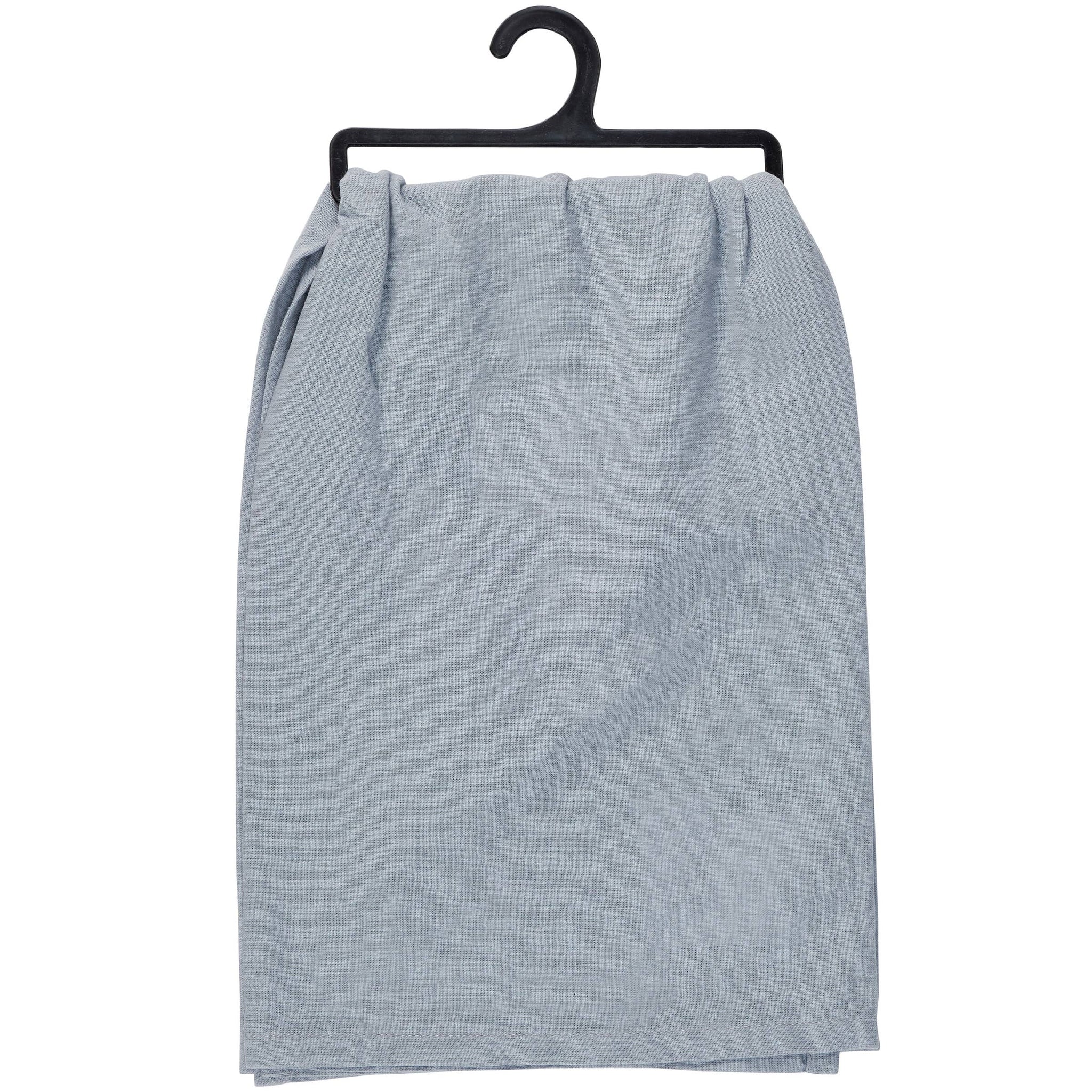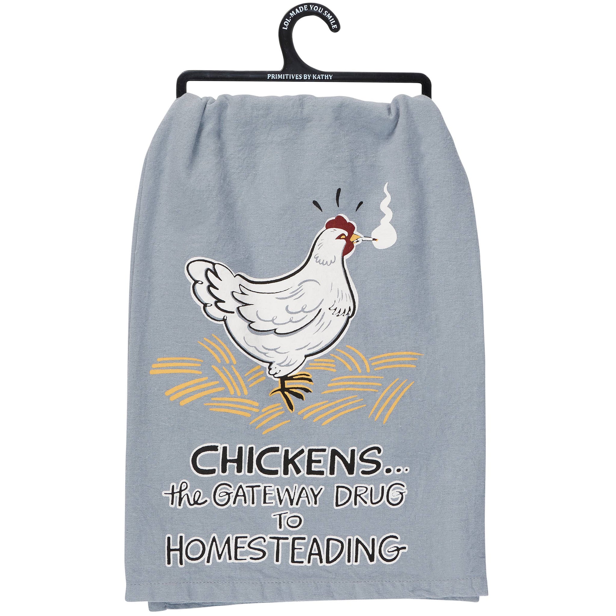 A blue cotton kitchen towel from our Homestead Collection displaying a design of chicken smoking a cigarette and a homestead inspired sentiment with unique hand illustrated details. Sentiment reads "Chickens... The Gateway Drug To Homesteading." Our Homesteading kitchen towel is conveniently machine-washable for easy cleaning. Packaged on a black plastic hanger to easily display on rack. A fun homestead-themed kitchen accessory perfect for everyday use.
